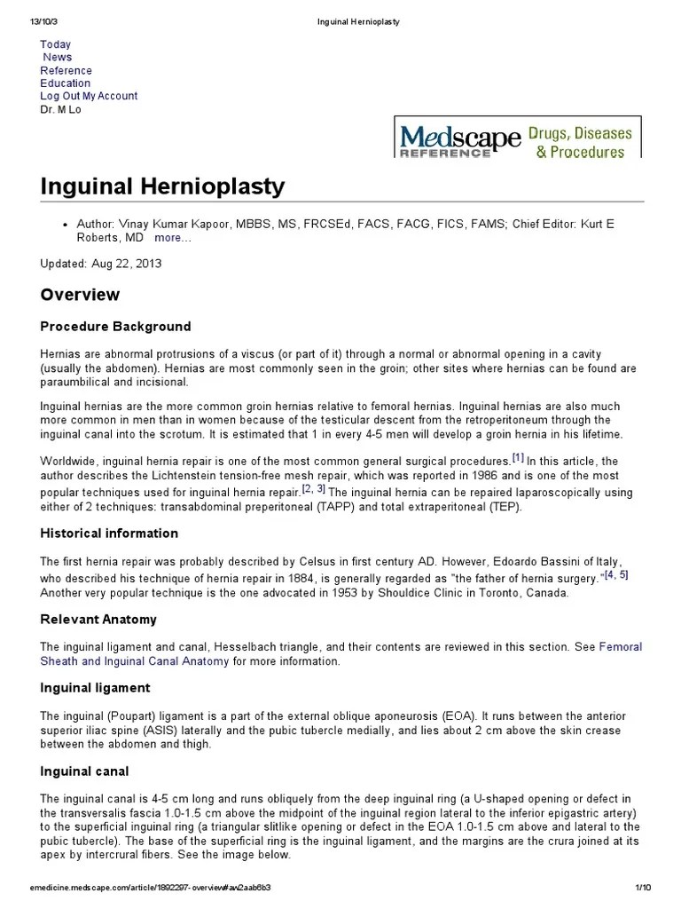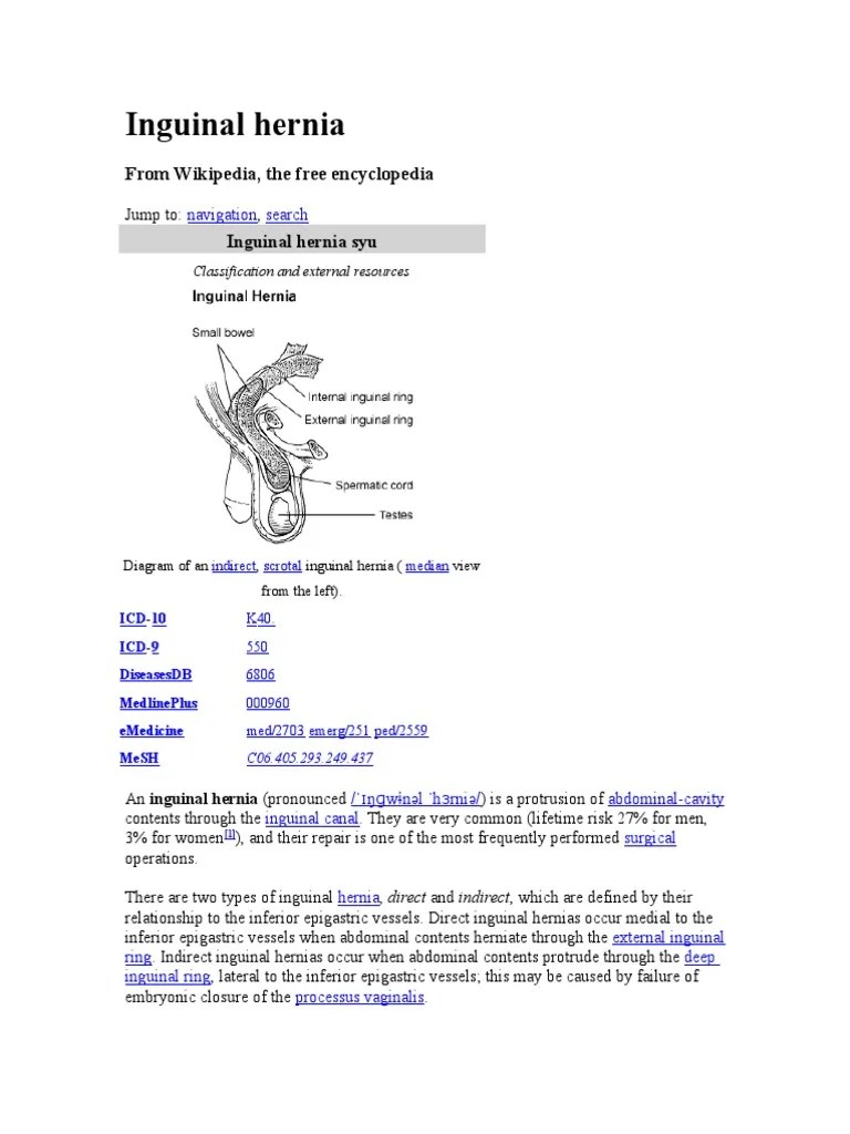 An indirect hernia is defined as a defect protruding through the internal or deep inguinal ring whereas a direct hernia is a defect protruding through the posterior wall of the inguinal canal. An inguinal hernia is usually not dangerous. The goal of this activity is to define current treatment protocols and clinical strategies and describe state of the art materials and techniques used in the surgical management of inguinal hernias. Direct inguinal hernias usually occur in adult males whose abdominal muscles have weakened.