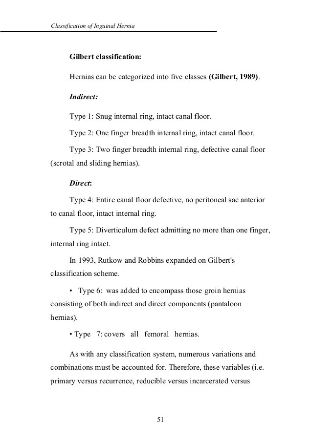 In 1989 gilbert published a classification system based. However for inguinal hernia with obstruction 88 underwent surgery with a death rate of 0 05 a ten fold increased risk of death. These two aspects may nonethe less be important in the repair of an inguinal hernia especially if they were not recognised and as a conse quence not treated leading to an early pseudo recur rence. Numerous classifications for inguinal hernias have been described and proposed to allow surgeons to define the anatomical type of hernia and to match the repair to the defect found.